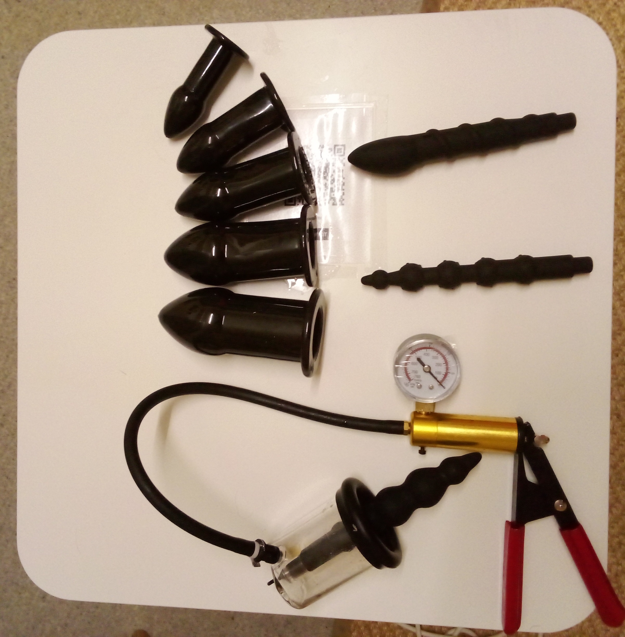 Poire à lavements, plug anal gonflable et appareil d'electro-stimulation.